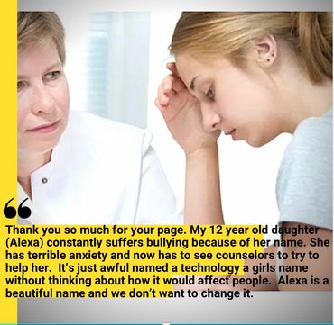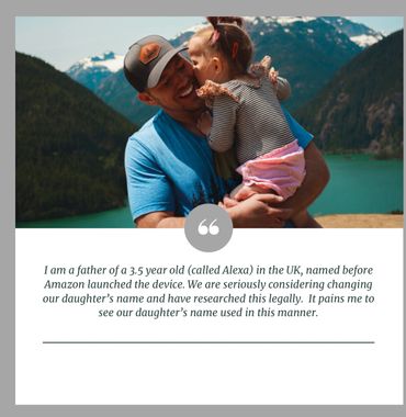 As a result of the Alexa brand, young children, teens, and women are experiencing severe bullying, harassment, legal name changes, suicidal ideation, sexual harassment, anxiety, therapy, identity erasure and more. Alexa is a Human advocates for children, women, and families who have been impacted by the use of the human name Alexa, as a voice technology brand.