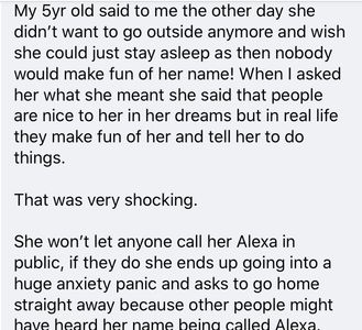 ” My 5 year old said to me (the other day) that she didn’t want to go outside anymore and wished she could just stay asleep as then nobody would make fun of her name!” (Alexa age 5)